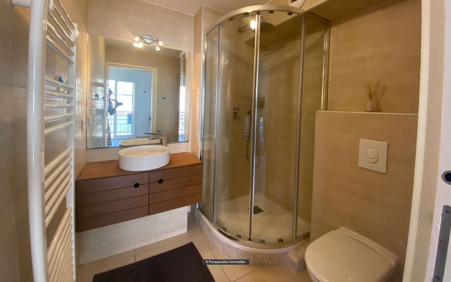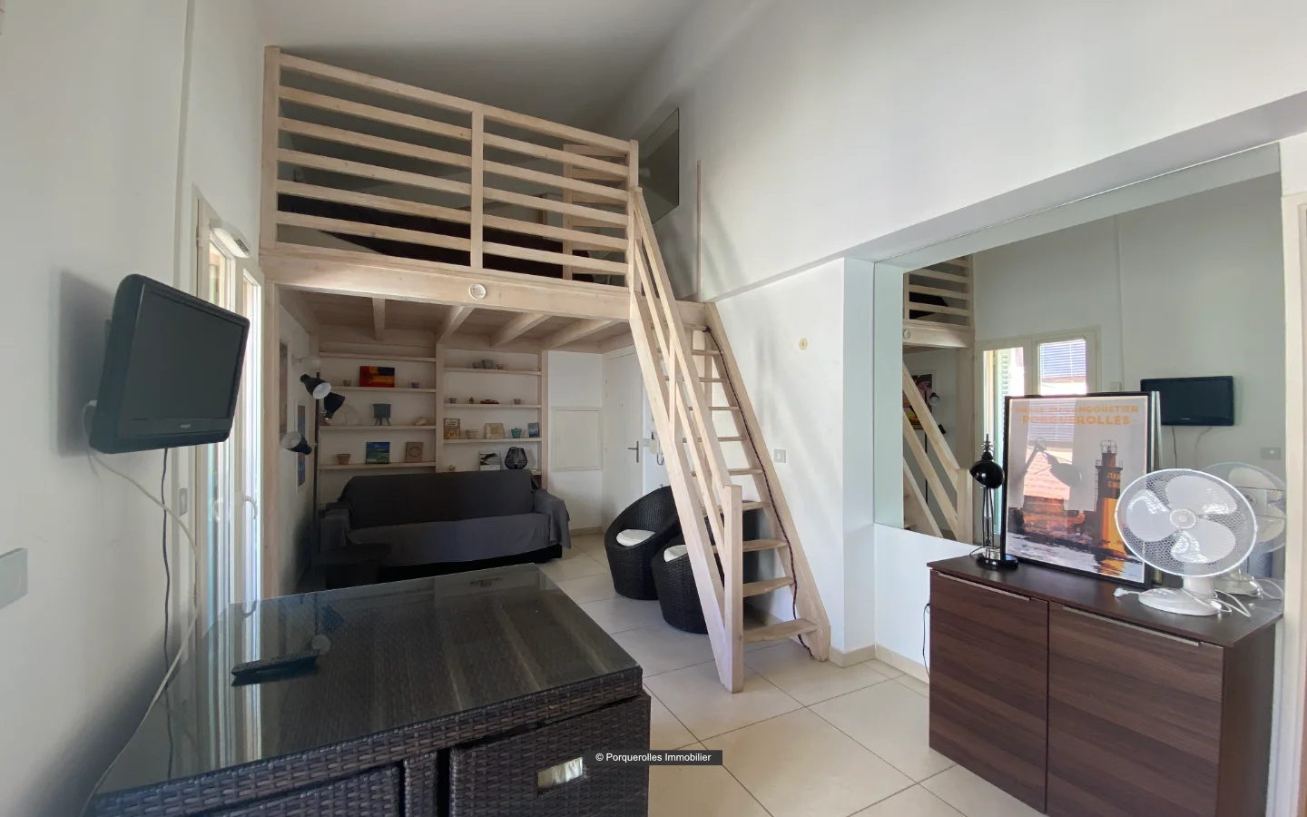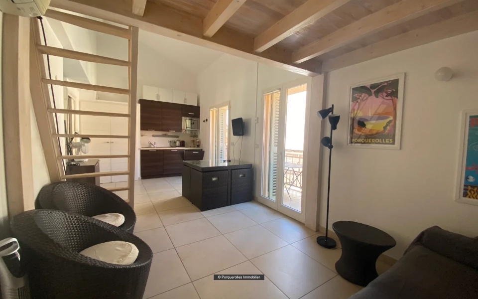 Cuisine : Incorporée au living – 2 feux vitrocéramique + Réfrigérateur + Micro ondes + Lave Vaisselle + Lave Linge