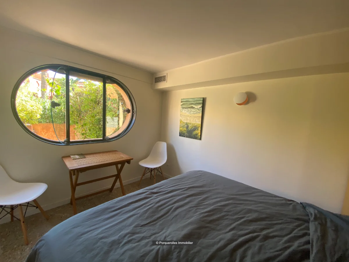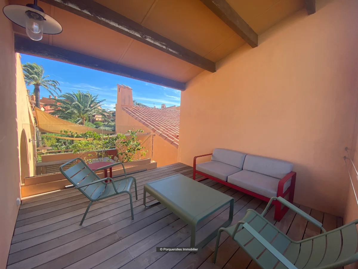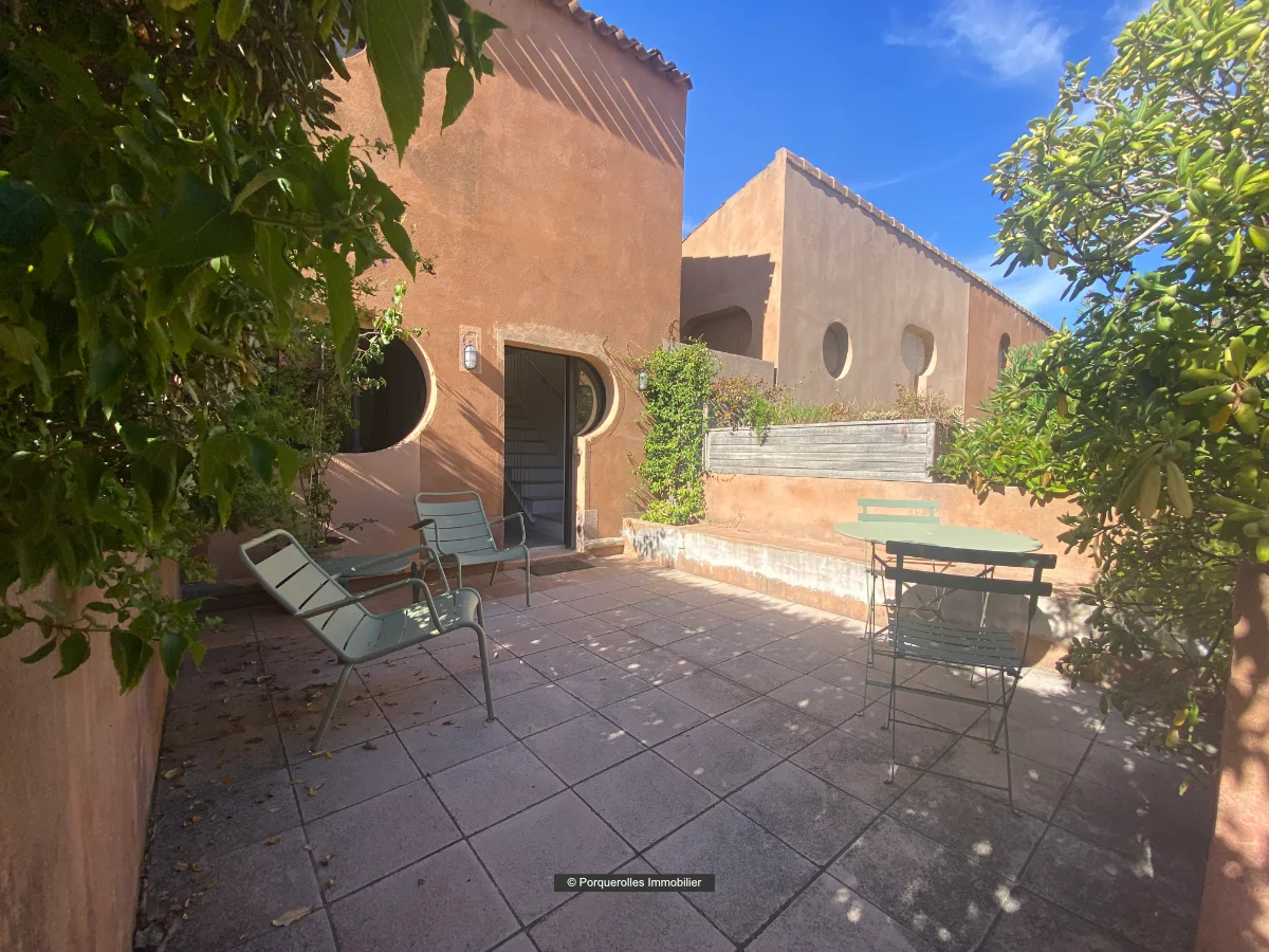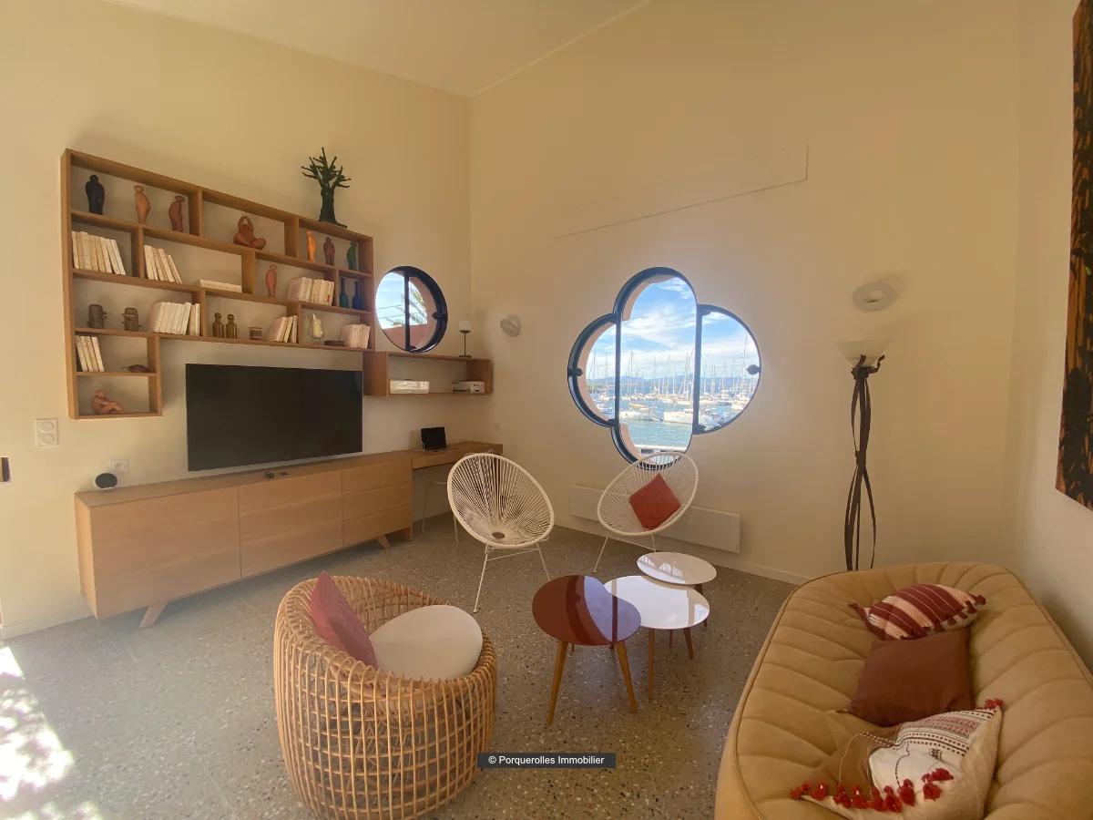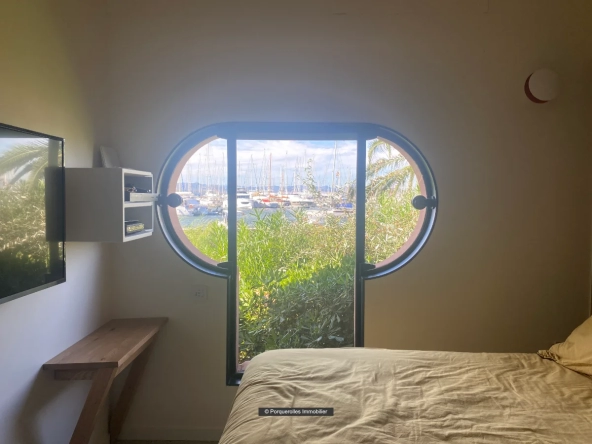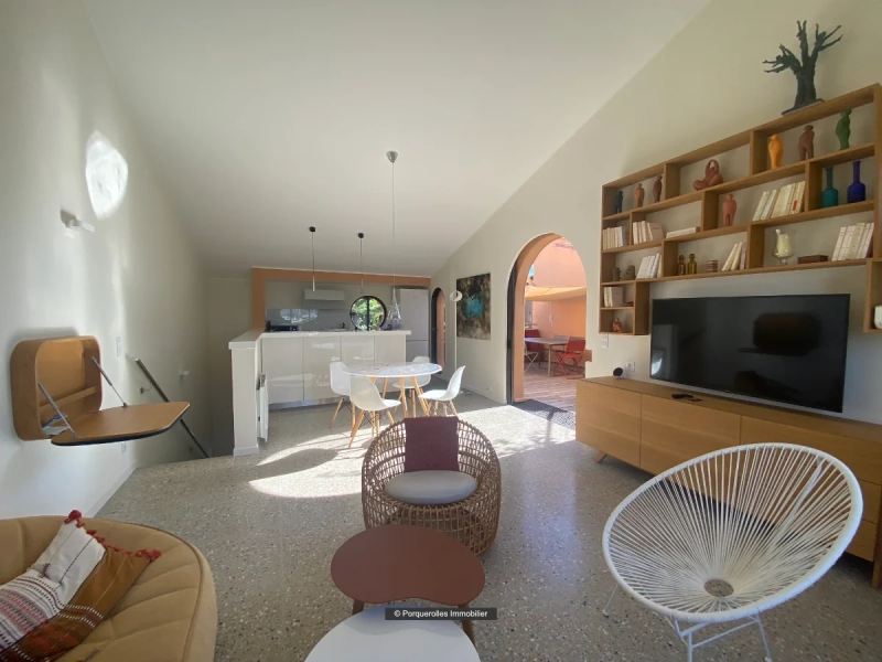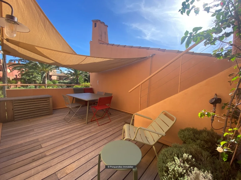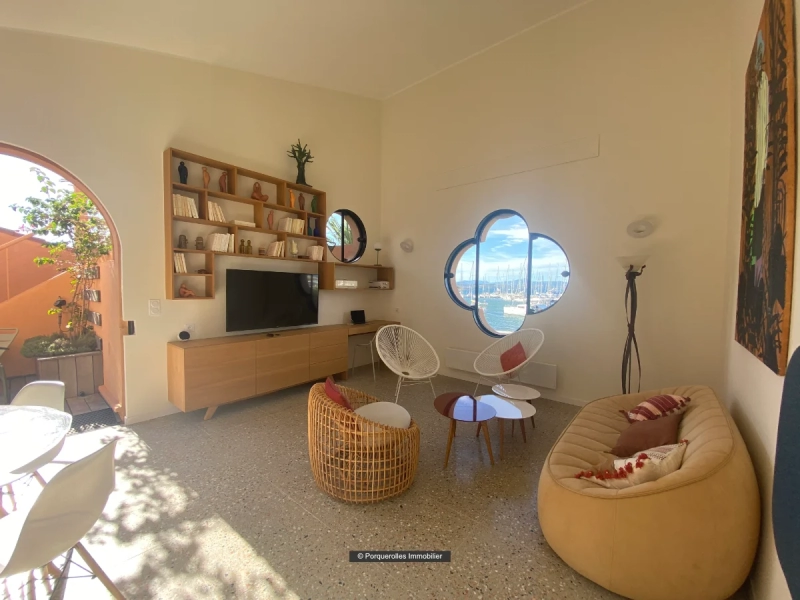 Rare à Porquerolles ! Superbe appartement duplex avec 3 pièces, entièrement refait à neuf avec goût par un architecte, mobilier de designer, vue mer.