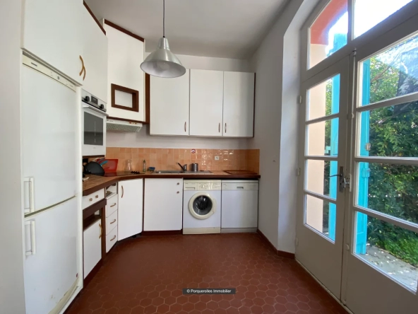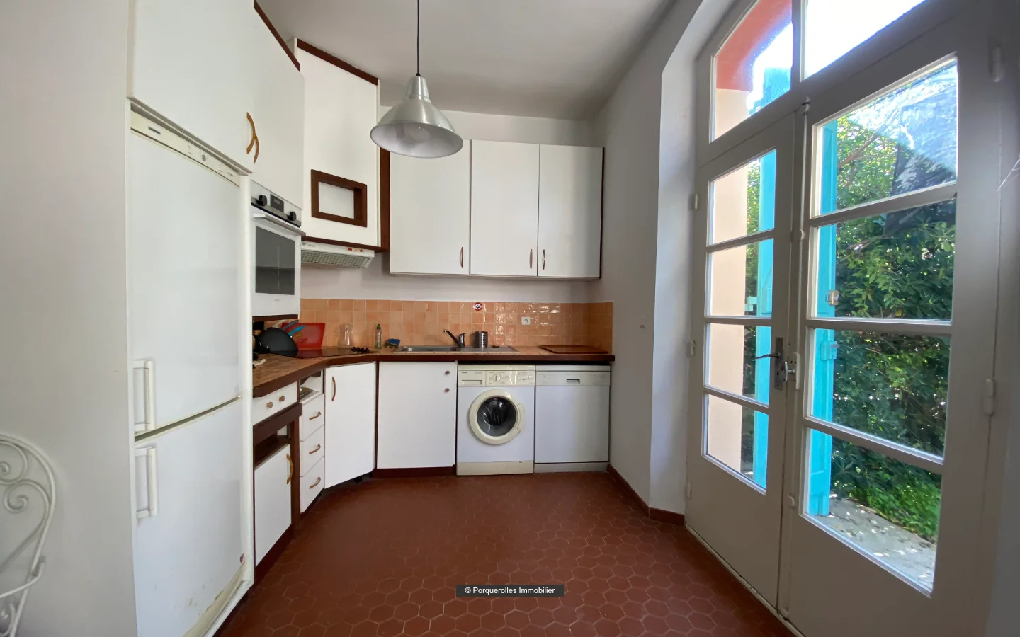 Cuisine : Incorporée au living – Vitrocéramique 4 feux + Four + Réfrigérateur + Congélateur + Micro ondes + Lave Vaisselle + Lave linge