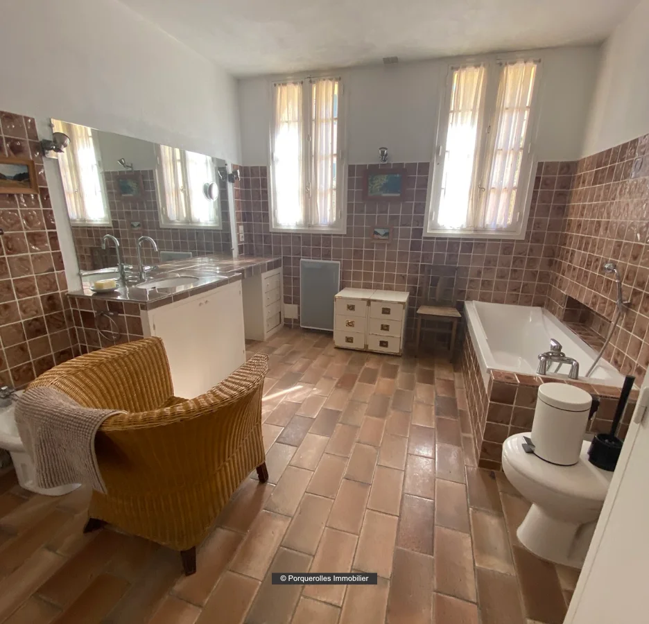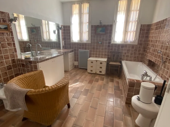 1 salle de bains avec baignoire, double vasque, wc et bidet.