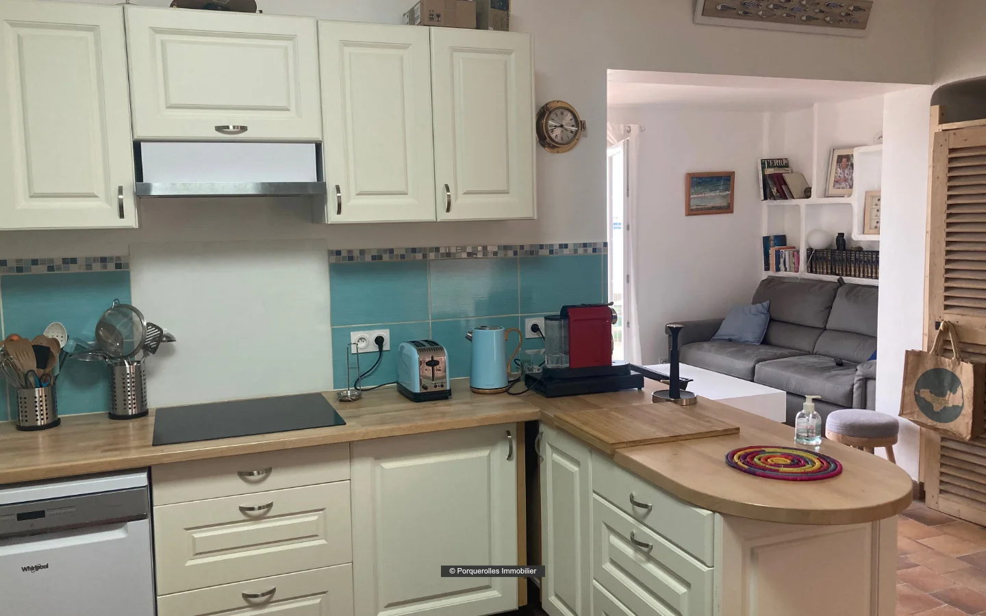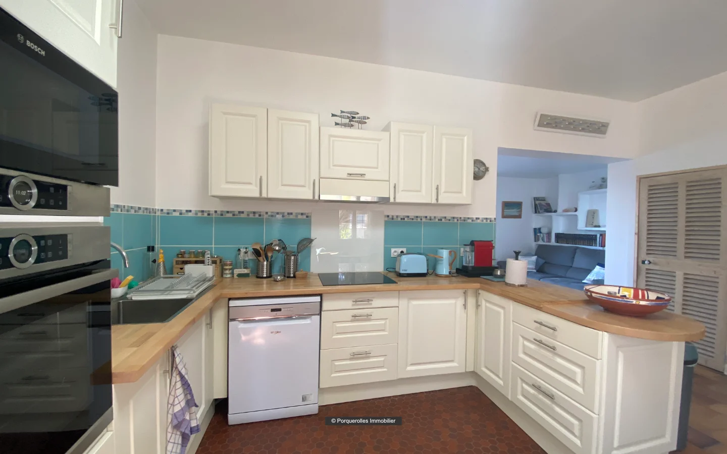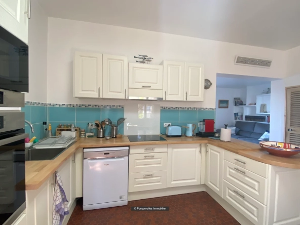 Cuisine incorporée au living : plaque de cuisson, four, micro-ondes, lave vaisselle, réfrigérateur, congélateur, lave linge.